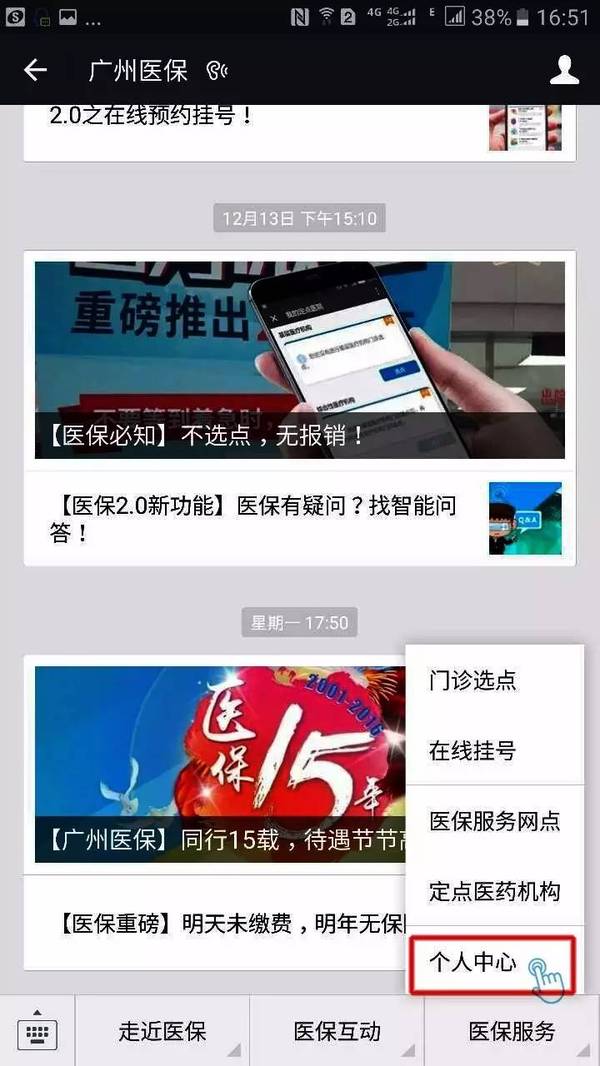 ①进入广州医保公众号,在“医保服务”菜单栏找到个人中心;