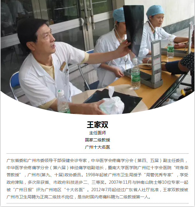 我院疼痛科、王家双神经痛会诊治疗中心教授王家双,在治疗疼痛相关疾病具有丰富的临床经验,其所带领的专家团队,更是在华南地区甚至整个中国疼痛治疗领域都具有话语权。