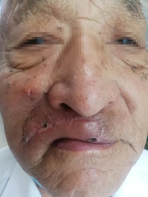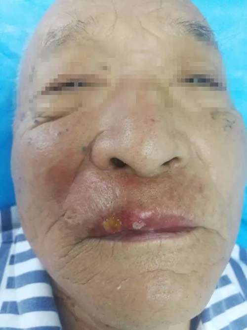 今年5月,一安徽老年患者,上唇肿物半年余,溃烂、持续剧痛,在当地就诊多家医院都无法诊断,疗效也甚微。其儿子多年皮肤病在徐医生的诊治下康复,对徐医生信任有加,他认为自己父亲的情况,找徐医生看看或许会有转机。于是经与徐医生反复沟通后,患者从安徽老家来到广州我院找徐医生诊疗。