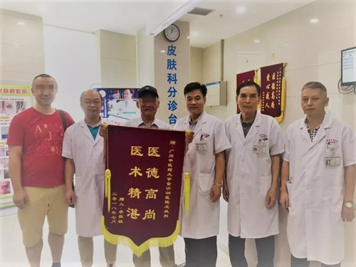 凭多年的临床经验,徐医生马上怀疑老人可能是恶性皮肤肿瘤,经过病理切片检查,证实为上唇鳞状细胞癌。随后在科室陈主任组织之下,徐医生和其他专家会诊并拟定手术方案,并快速为患者进行了肿瘤切除及上唇修复术,不但完整切下肿瘤而且极佳地恢复老人上唇外观及功能,让病人及家属十分感激。老人出院时亲自携家人送来致谢锦旗,徐医生站在一旁,为自己又帮助了一名患者而充满欣慰。