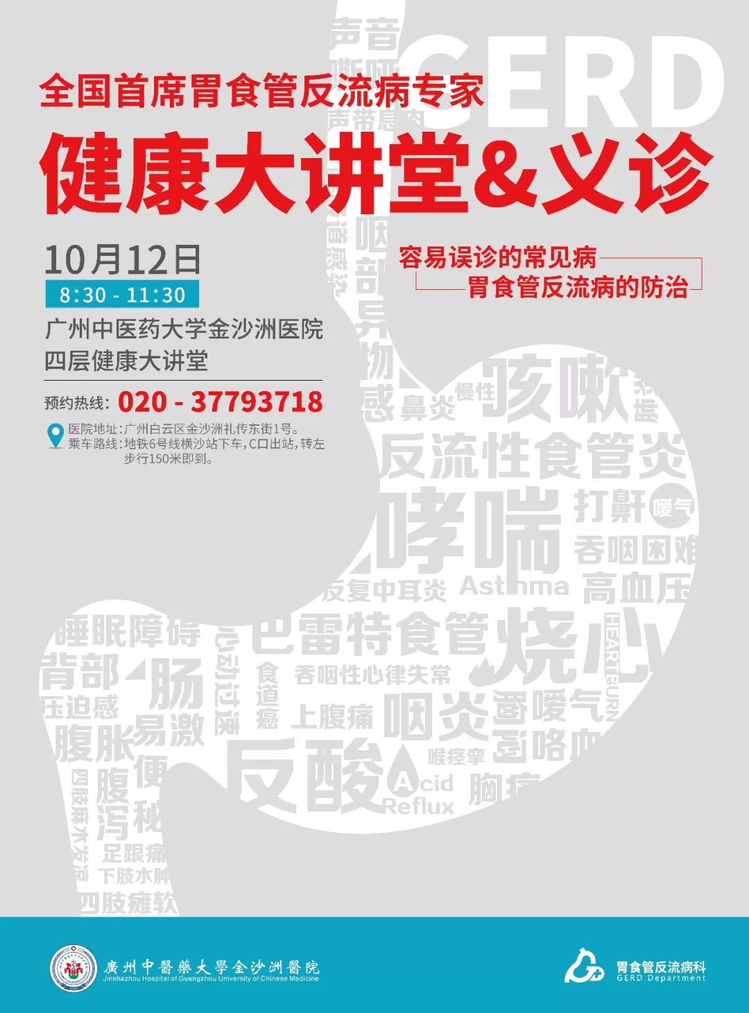 广州中医药大学金沙洲医院胃食管反流病科专业致力于胃食管反流疾病的诊治。为提高广大市民对胃食管反流病的认识,科室将在10月12日上午举行大型公益健康知识讲座以及义诊咨询活动。