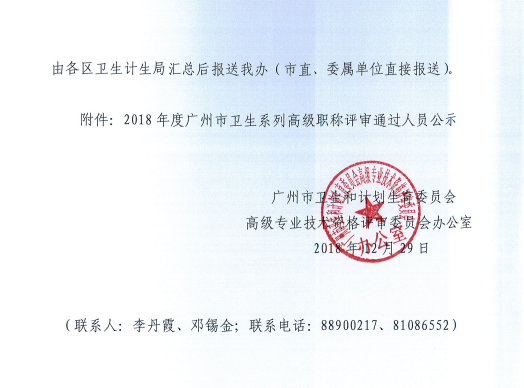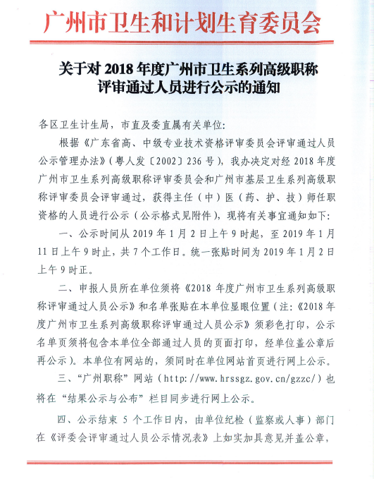 关于对2018年度广州市卫生系列高级职称评审通过人员进行公示的通