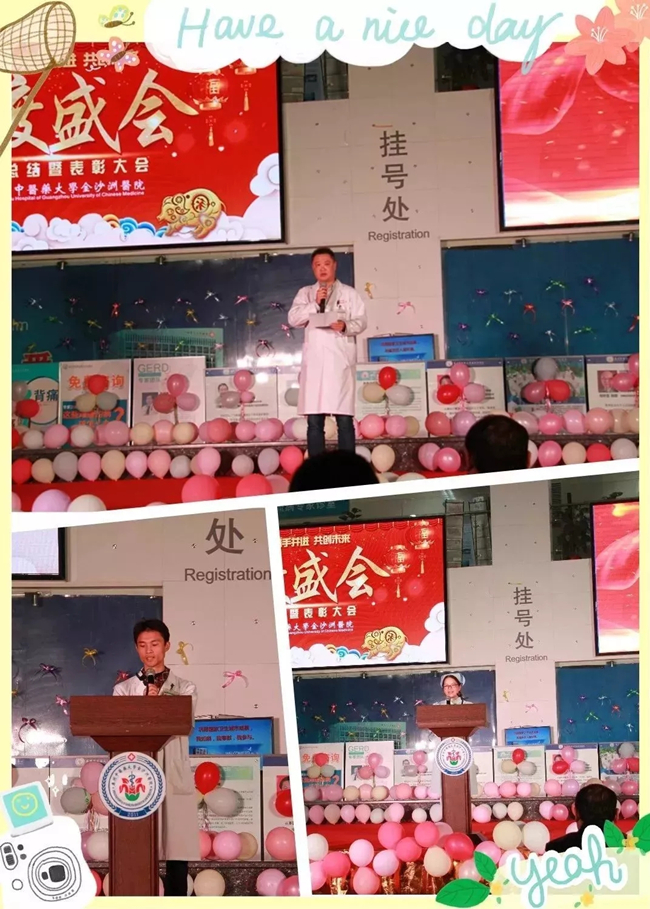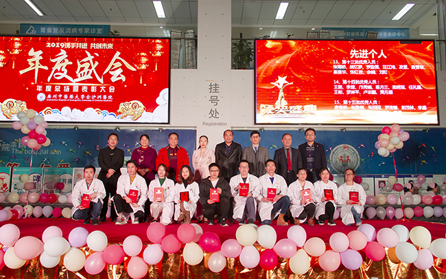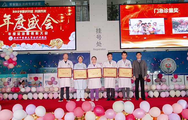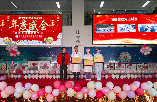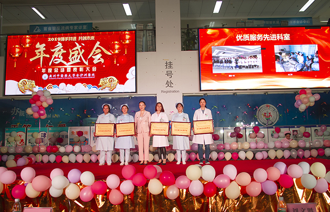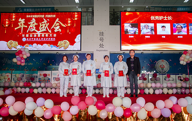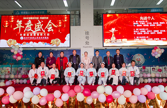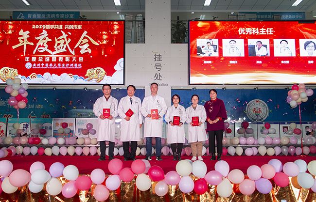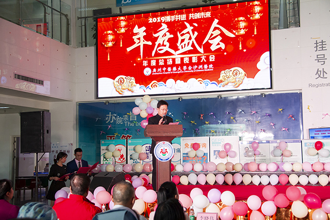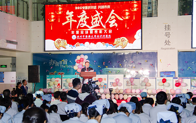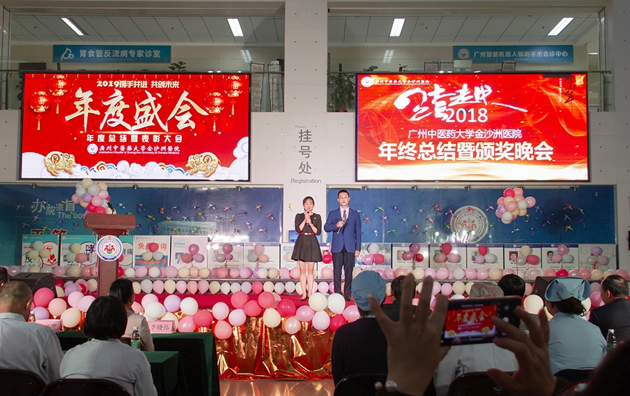 2019年1月23日晚,广州中医药大学金沙洲医院2018年度工作总结暨表彰大会在门诊1楼隆重举行,院领导班子、各职能科室主任、临床科室主任、护士长及全院职工参加了本次会议,会议由ICU护士长胡欢、康复治疗中心何伟鹏主持。