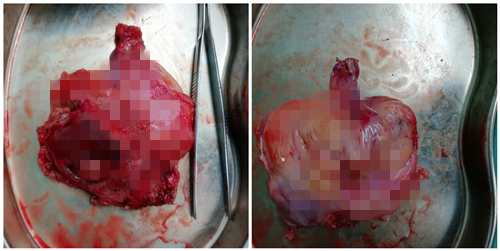 术中见脐尿管上段连接腹壁,下段与膀胱顶相连接,脐尿管下段肿大,以与膀胱连接部尤为明显,大小约4*3.5cm。手术将脐尿管和膀胱部分切除,在膀胱与脐尿管连接肿大部位外约3cm位置剪开膀胱,见膀胱顶部一肿物,大小约3*2.5cm,表面破溃,有血痂样坏死物,沿距离肿物周边约3cm位置将肿物完整切除,连续缝合膀胱,同时行盆腔淋巴结清扫术。