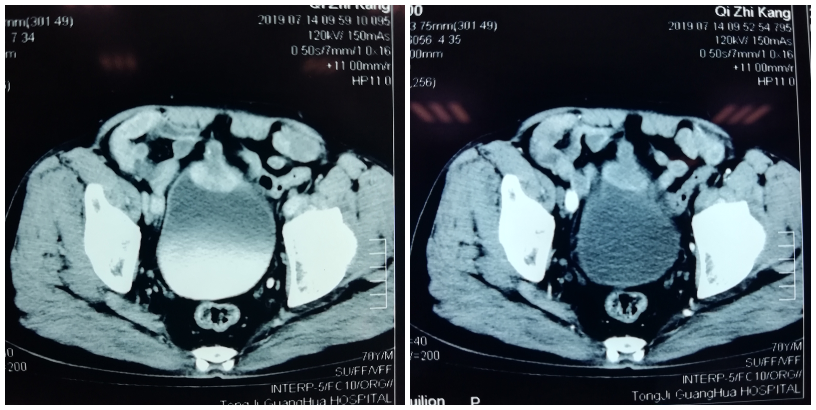 患者为男性,70岁,主诉1月余前无明显诱因出现肉眼血尿,呈间断性发作,无明显畏寒发热,无明显疼痛不适,就诊于当地医院,行增强CT检查提示“膀胱前上壁改变,考虑脐尿管癌,累及膀胱”,建议患者积极手术治疗。现为求手术治疗,就诊于我院泌尿外科门诊,门诊拟“脐尿管恶性肿瘤”收入泌尿外科病房。患者自发病以来,精神、食欲及睡眠一般,大便正常,体重未见明显减轻。