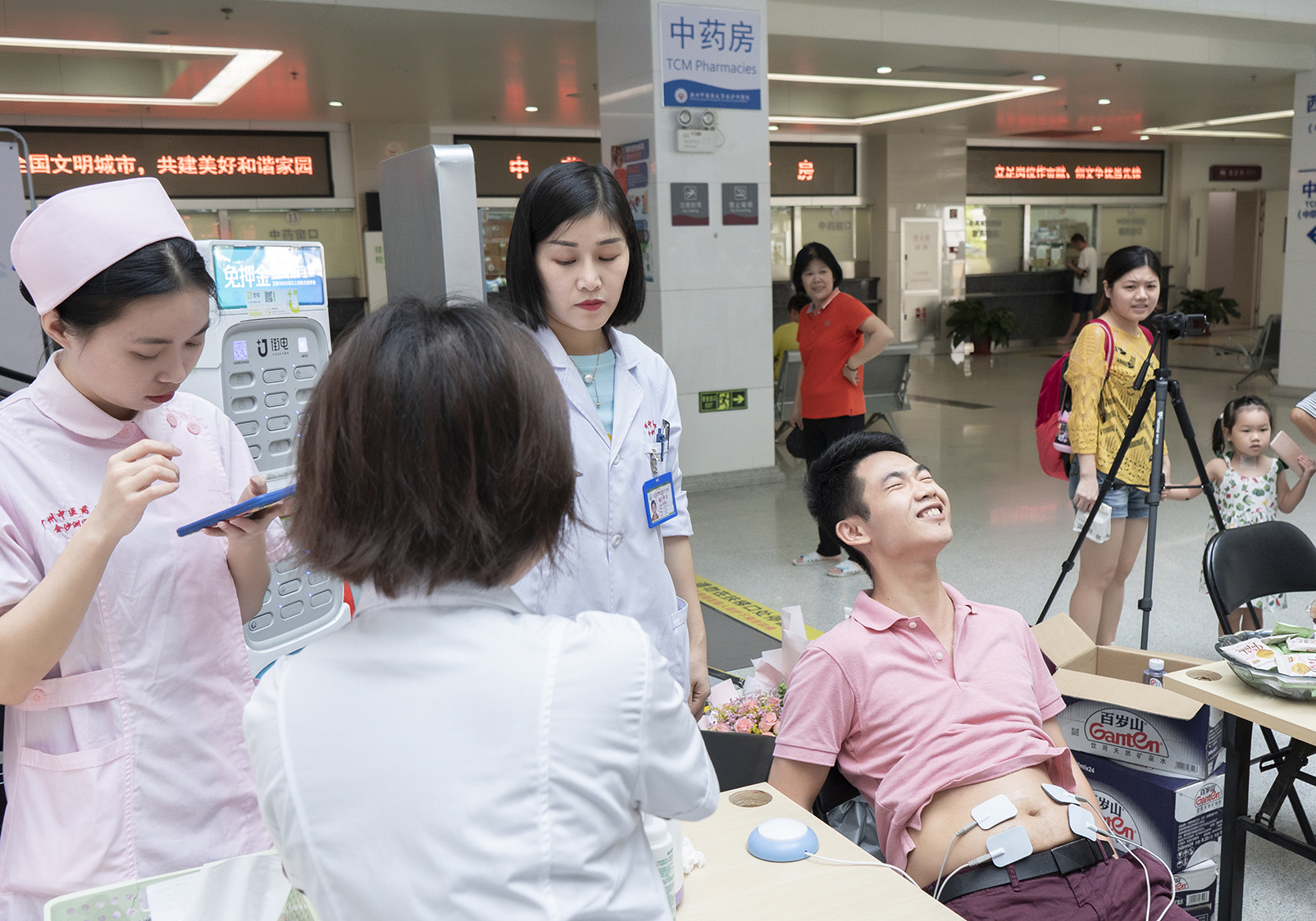 活动尚未开始,现场就有一大群人围观着产科医生们摆出来的一台仪器了。这是什么东西?为什么具有这么大的魅力?原来那是分娩疼痛体验仪器。要做个合格的爸爸,一定要体验我们的分娩阵痛仪,感受一下当妈妈的不易,只有体验才能更好的理解,理解才让爱升华!瞧,不少准爸爸就勇敢上前体验了!