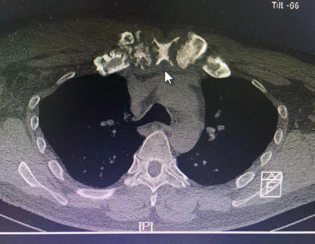 术前(图一)炎性损毁的胸骨、双侧锁骨和第一肋骨