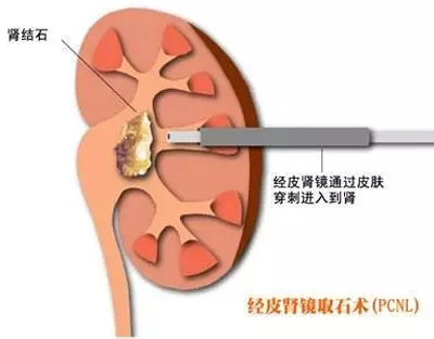 经皮肾镜取石术是近十余年发展较快的一种微创治疗手段,是在腰部建立一条从皮肤到肾脏的通道,肾镜通过这个通道进入肾集合系统,找到结石后,利用气压弹道、钬激光、超声等碎石工具,把肾结石击碎并取出至体外。就是所谓的“打孔取石”。主要适用于1.5cm以上的肾结石、输尿管上段结石。
