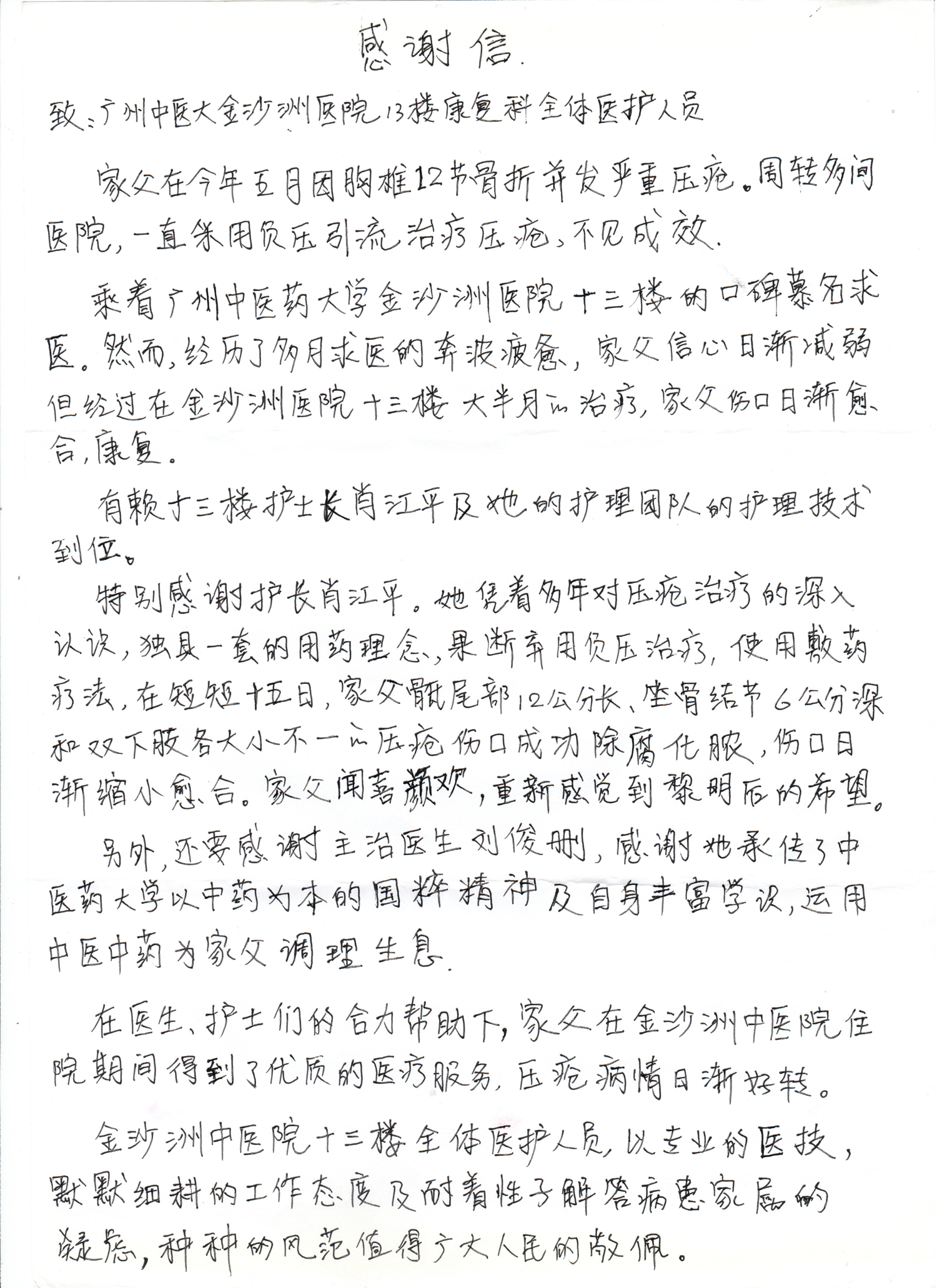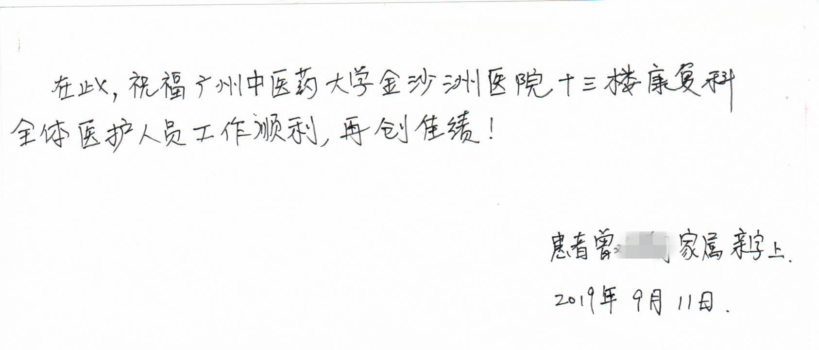 近日,我院康复三科患者曾叔家属将一封简单朴实,却充满了感激之情的感谢信送到了康复三科,表达对住院期间康复三科全体医生、护士给予的精心治疗和无微不至关怀的感谢。
