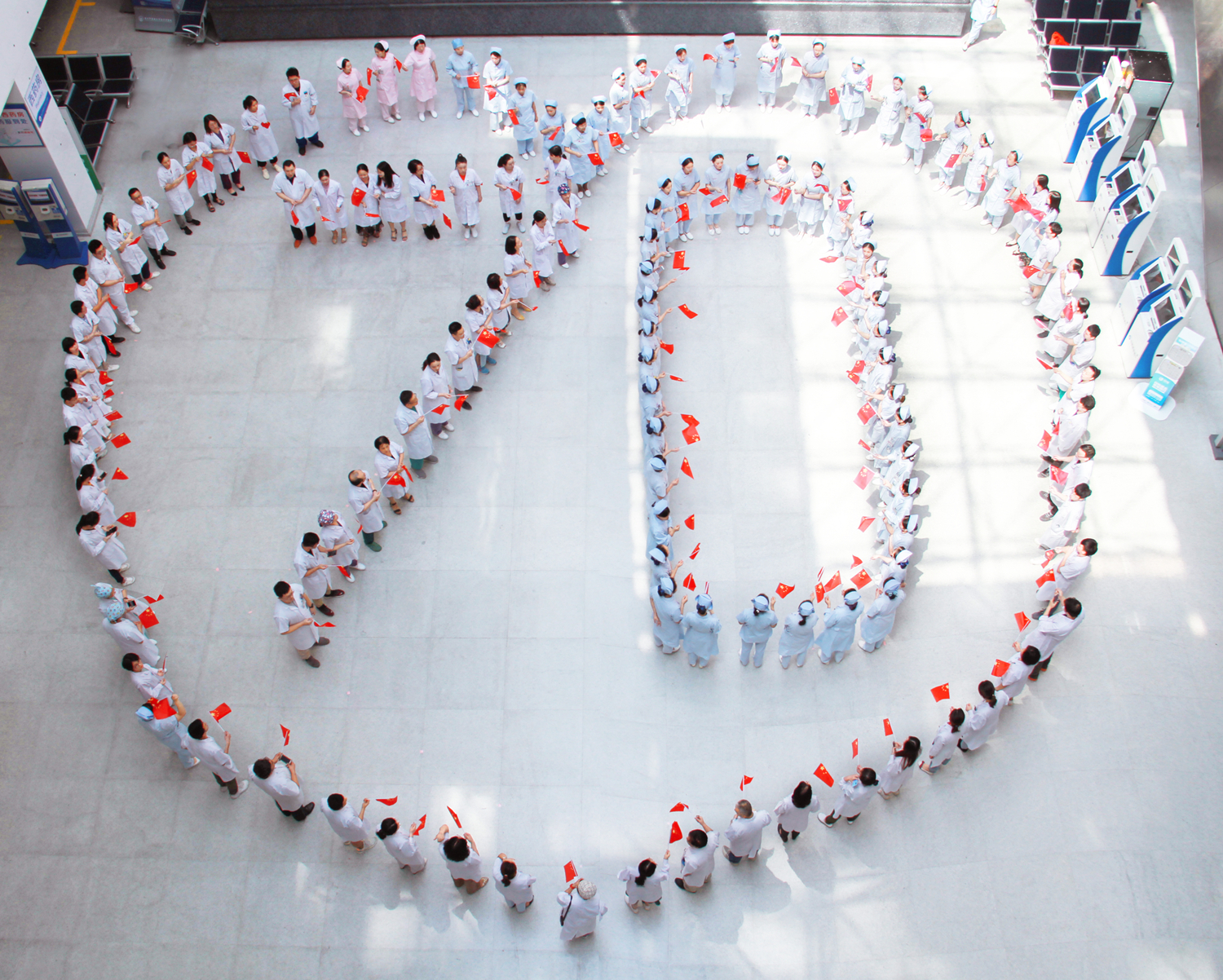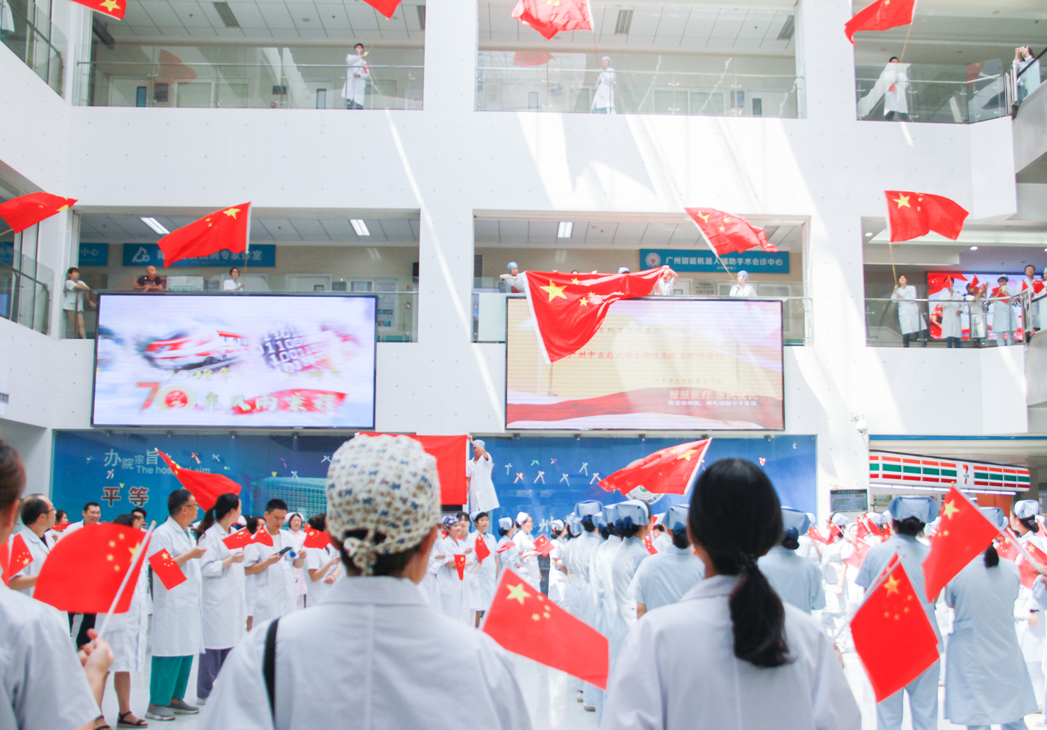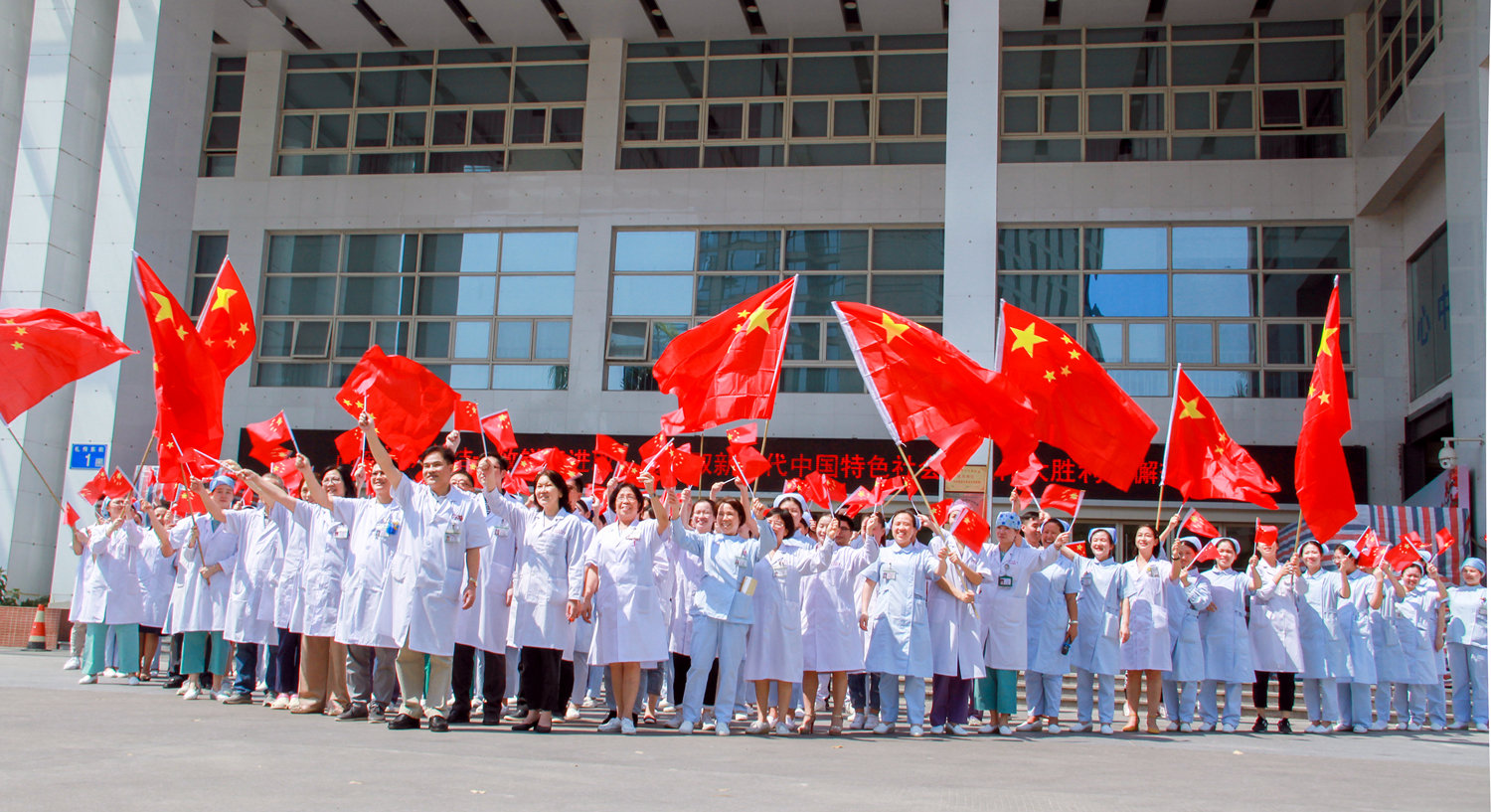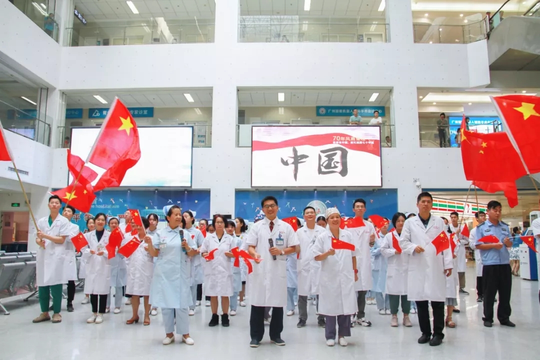 值此新中国成立70周年之际,金沙洲医院全体职工真诚祝福:祖国繁荣昌盛!我们会将快闪活动中激发出来的热情投入到建设发展医院事业中去,牢记健康使命,不忘医者初心,加强业务学习,提高诊疗水平,改善就医环境,优化服务流程,努力以精湛的医术、一流的服务回馈广大人民群众,服务社会,与祖国母亲携手共进,共谱新章!
