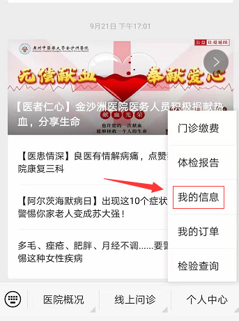 关注“广州中医药大学金沙洲医院”公众号,点击菜单“个人中心—我的信息”