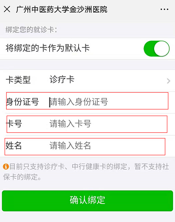 请输入个人身份证号、就诊卡号、姓名来绑定就诊卡,并将当前就诊卡用户自动设置为默认用户。