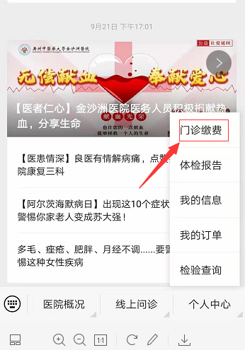 首先进入“广州中医药大学金沙洲医院”公众号,依次点击“个人中心—门诊缴费”
