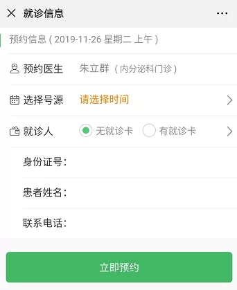 按要求填写就诊信息,点击“立即预约”,即可预约成功。预约成功之后可收到一条手机短信确认相关信息。