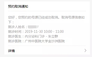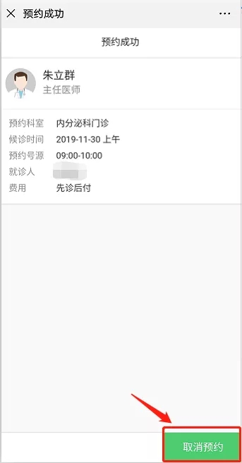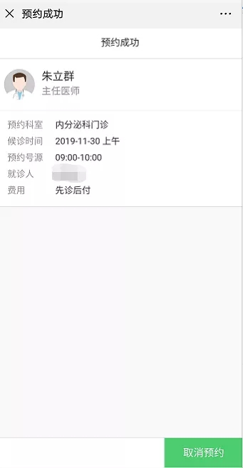 预约挂号成功后,若有事想取消预约,点击右下角“取消预约”即可取消。