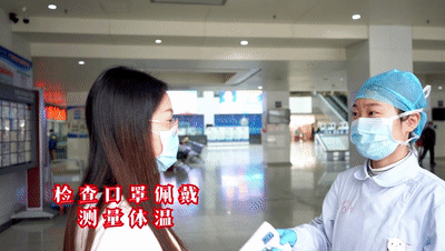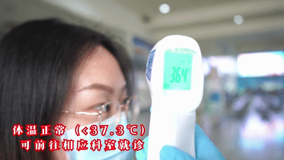 门口入口处工作人员测量来院人员体温与检查口罩佩戴情况。发现发热(≥37.3℃)的病人,工作人员指引病人到门诊大厅预检分诊处进行预检分诊。