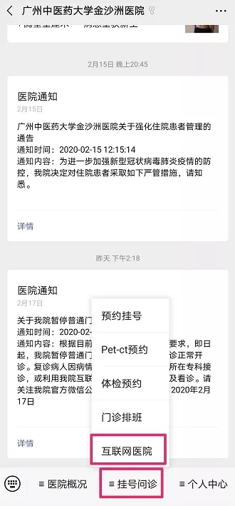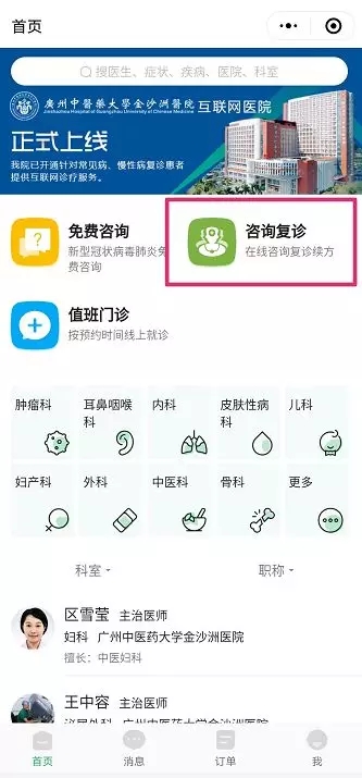 1、微信搜索“广州中医药大学金沙洲医院”小程序,进入互联网医院界面,或者在“广州中医药大学金沙洲医院”公众号菜单栏“挂号问诊”—“互联网医院”进入小程序。