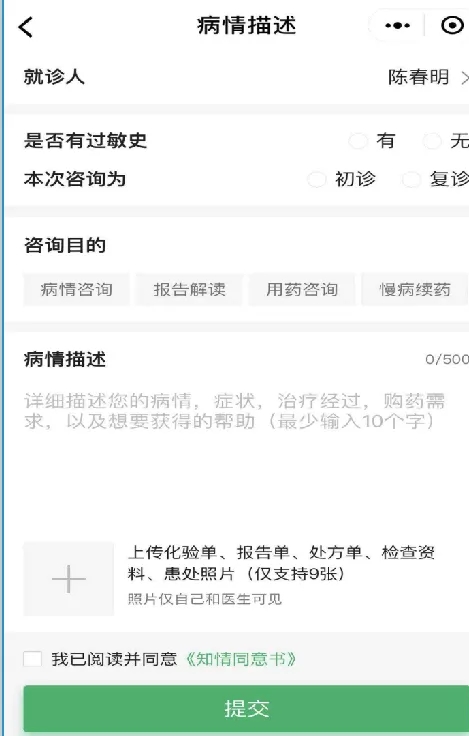 2、填入患者资料,上传疾病文字描述及图片资料,提交并支付费用。