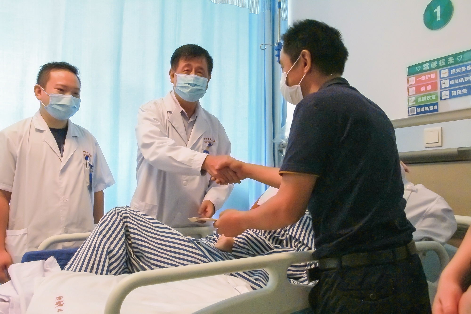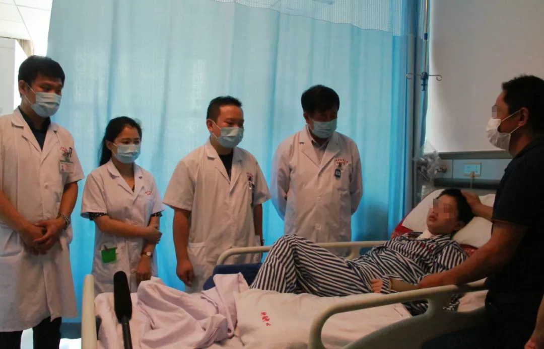 小唐即将出院,小唐爸妈开心地与医护人员合影