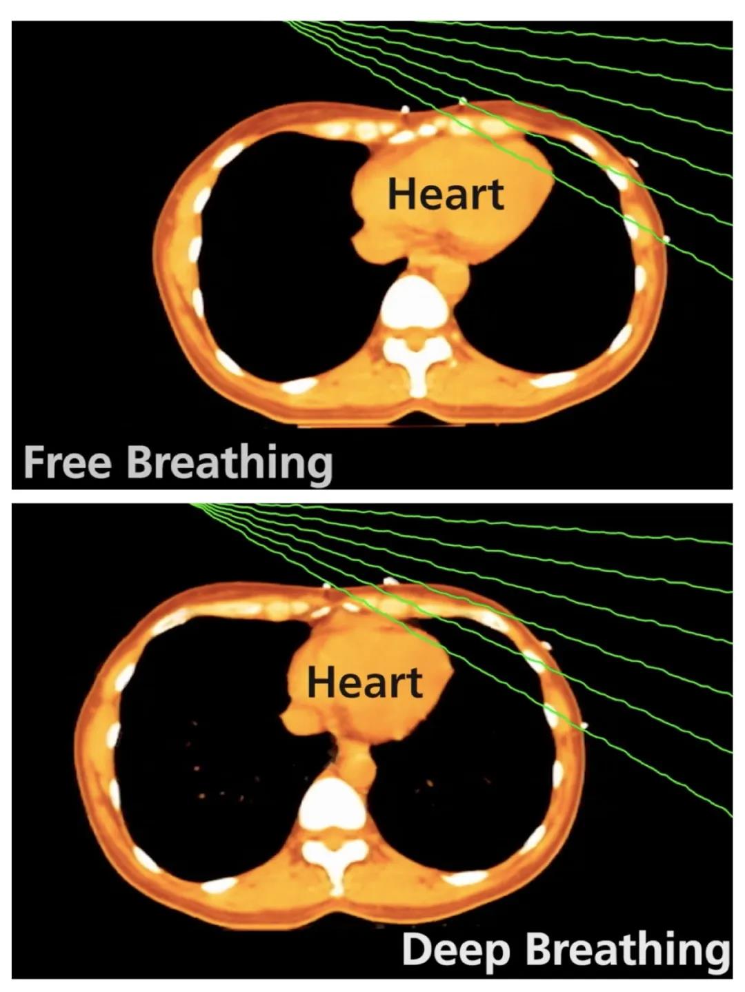 以乳腺癌为例,左乳离心脏最近,如果放疗时没有保护好附近的正常组织,患者容易在近期出现心律失常、心包炎,远期出现心血管事件包括心肌梗死、冠心病等。所以如不控制胸腔呼吸时的幅度,左乳随着呼吸忽上忽下,怎么能够确保射线精准射击,以及不误伤“近邻”心脏?