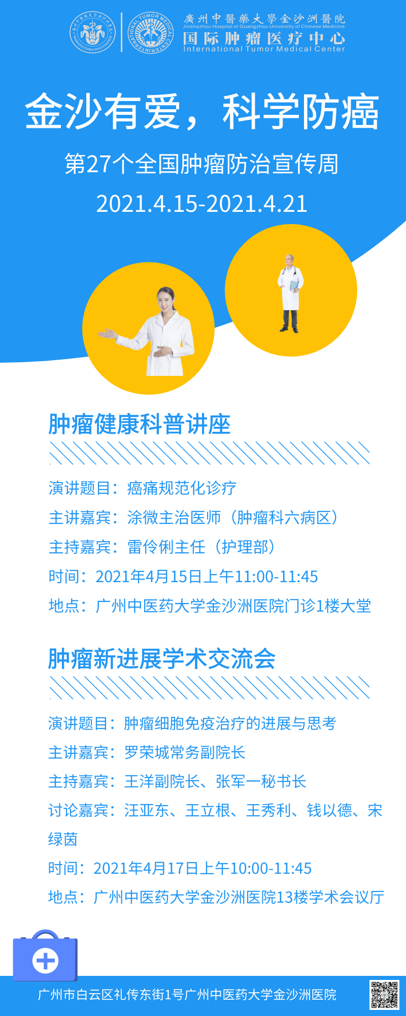 2021年全国肿瘤防治宣传周即将来临,广州中医药大学金沙洲医院、广州抗癌协会联合主办的多种形式“金沙有爱,科学防癌”肿瘤防治宣传系列活动将于4月15日起在广州中医药大学金沙洲医院举行。